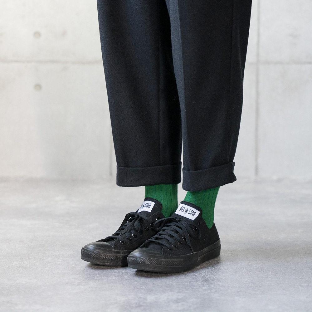 ダークトーンになりがちな日にも、足元に差し色を加えて洒落感アップ。カジュアルにもキレイめにもハマるから、平日も休日も頼れる万能ソックス。