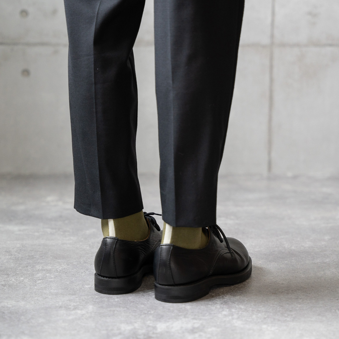 グレーパンツ×ブラウンローファーの定番コーデに、グリーンのバックライン入りソックスを差し色としてプラス。